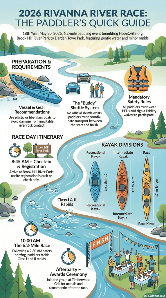 A 6.2-mile paddling race down the Rivanna River in scenic Albemarle County, VA, skirting the city of Charlottesville. This is a mostly gentle section of the river with some Class I rapids and maybe one Class II rapid, depending upon water levels. Previous river paddling experience is highly suggested.
